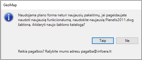 •Jeigu jūsų naudojamas šablonas yra senesnės versijos, tai programa informuos apie tai. Galėsite pasirinkti ar atsidaryti šablono katalogą ir persikopijuoti šabloną su naujausiais pakeitimais, ar tęsti darbą su senu šablonu.
